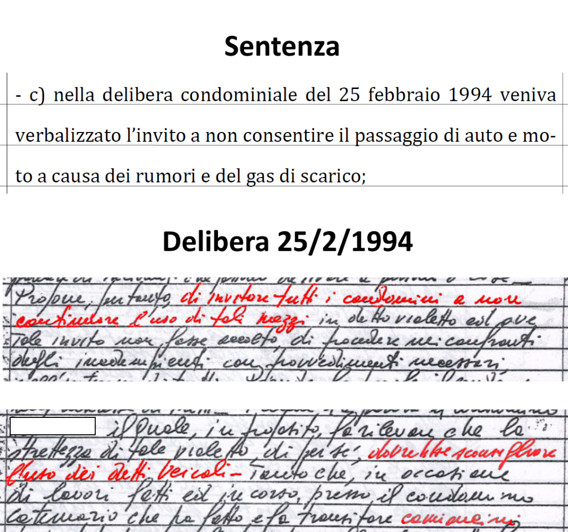 Da come la leggo io nel 1994 i condomini invitavano a NON USARE MEZZI ingombranti (camioncini) che generavano gas e rumori, NON A "non consentite il passaggio di auto e moto" che infatti: